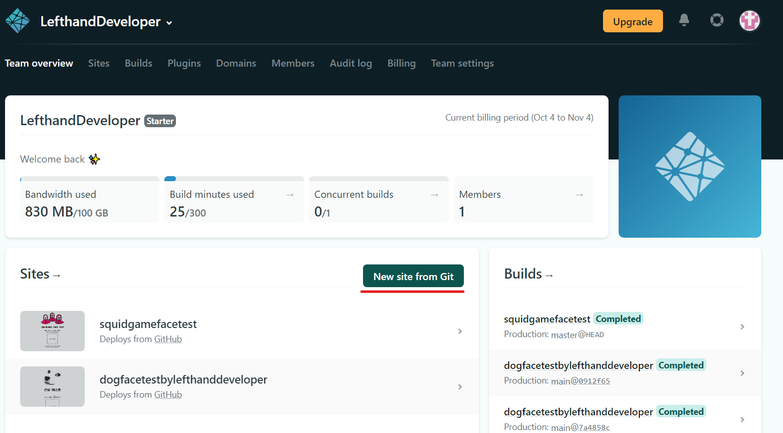다음 Team overview 메뉴를 클릭하여 보여지는 화면에서 New site from Git을 클릭해줍니다. (저는 이미 배포한 사이트가 2개가 있어서 Sites아래에 2개의 배포된 목록을 볼수있습니다)