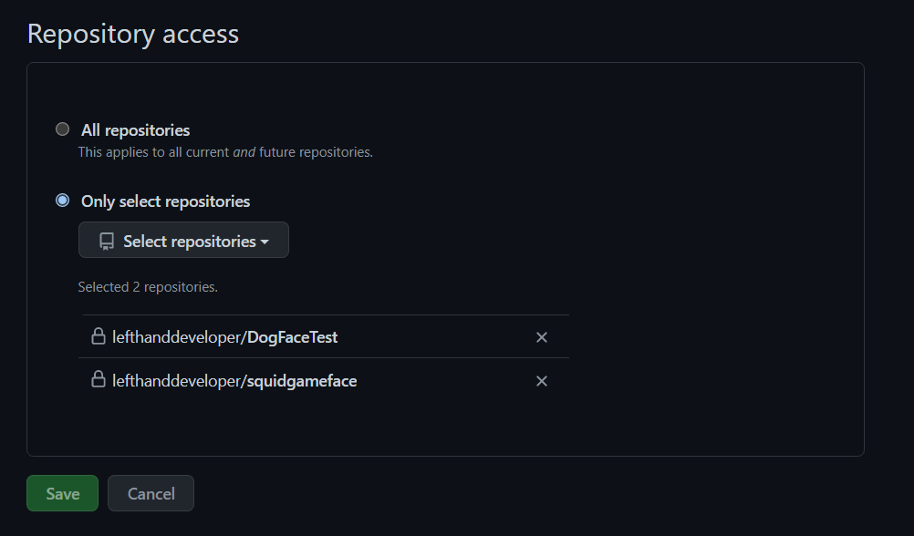 그리고 나타나는 화면에서 아래쪽부분을 보게 되면 아래 사진과 같은 부분이 나옵니다. 만약 모든 repository를 netlify에서 배포할수있게 리스트를 접근할수있게 하고싶다면 "All repositories"를 선택해주시고 선택적으로 고르고 싶다면 "Only select repositories"를 선택하시고 토글 버튼을 누르시면 본인의 repository 리스트가 나올겁니다. 배포 원하는 repository를 선택해줍니다.
