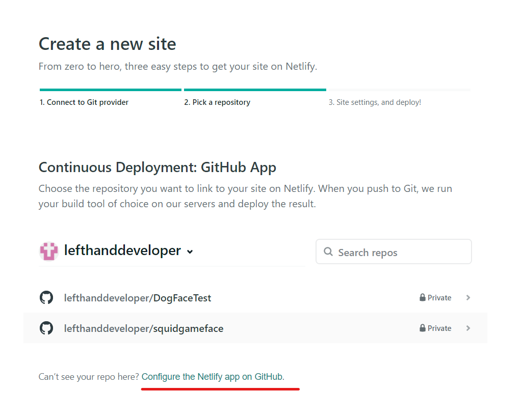 다음 화면에서 배포할 수 있는 Repository 리스트가 나올텐데, 만약 나오지 않는다면 아래쪽에 Configure the Netlify app on Github 을 클릭해줍니다.