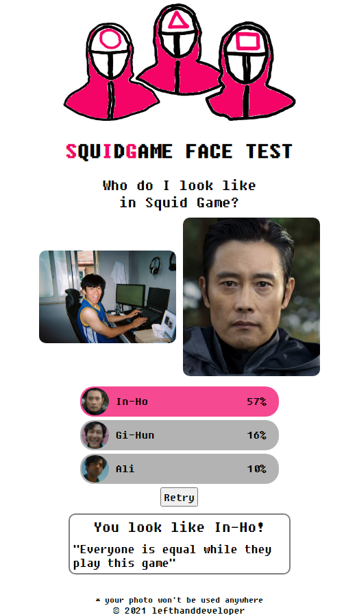 이름은 Squid Game Face Test로 요즘 오징어게임이 해외에서도 많이 핫해서 영어로 만들어보았습니다. 오징어게임 드라마 내 캐릭터 12명을 선발해서 python으로 작성한 web crawling 코드로 각각 50개의 사진을 가져와서 쓸만한 사진들을 선별하고 google teachable machine을 사용해서 machine learning을 시킨 데이터를 가져와 내가 찍을 사진과 비교를 해서 결과를 내는 구조입니다.