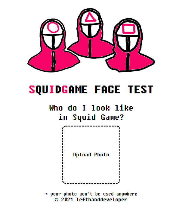 저번 견상테스트에 이어서 비슷한 컨셉으로 요즘 핫한 오징어게임 얼굴 테스트를 만들어보았습니다. 견상테스트의 코드를 똑같이 복사붙여넣기하면 공부가 될거같지가 않아서 나름 처음부터 다시 코드를 작성했는데 결국 작성한 코드를 보니 견상테스트 때 작성한 코드와 거의 동일하게 되더군요... 역시 스타일은 잘 바뀌지 않나봅니다.