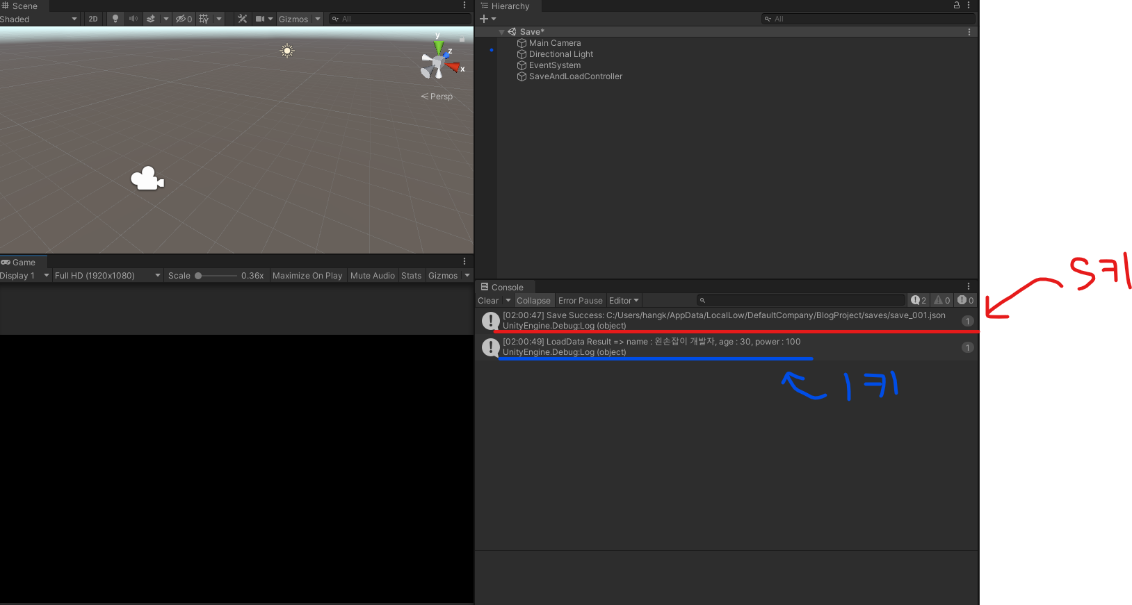 다음 키보드 l을 누르면 SaveSystem.Load(...)함수에서 저장파일 이름을 ("save_001")을 파라미터로 넘겨주어 저장 파일을 불러옵니다. 그리고 확인을 위해 loadData의 name, age, power를 log로 남겼습니다.