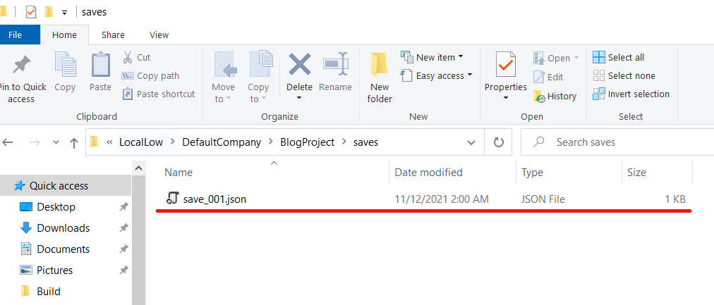 저는 Save(..) 함수에서 SaveData 와 string으로 저장파일이름을 파라미터로 받아서 저장을 하게 했습니다. 저장위치는 Application.persistantDataPath + "/saves/" 로 했습니다.(여기는 C:\Users\{컴퓨터유저이름}\AppData\LocalLow에서 찾을 수 있습니다.) 그리고 Load(...) 함수에선 저장파일의 이름을 파라미터로 넣어서 불러오게 만들었고 return value로 SaveData 형식으로 return 합니다. 그러면 실제로 이거를 실행하는 스크립트를 하나 만들어서 실행 코드를 보도록 하겠습니다.