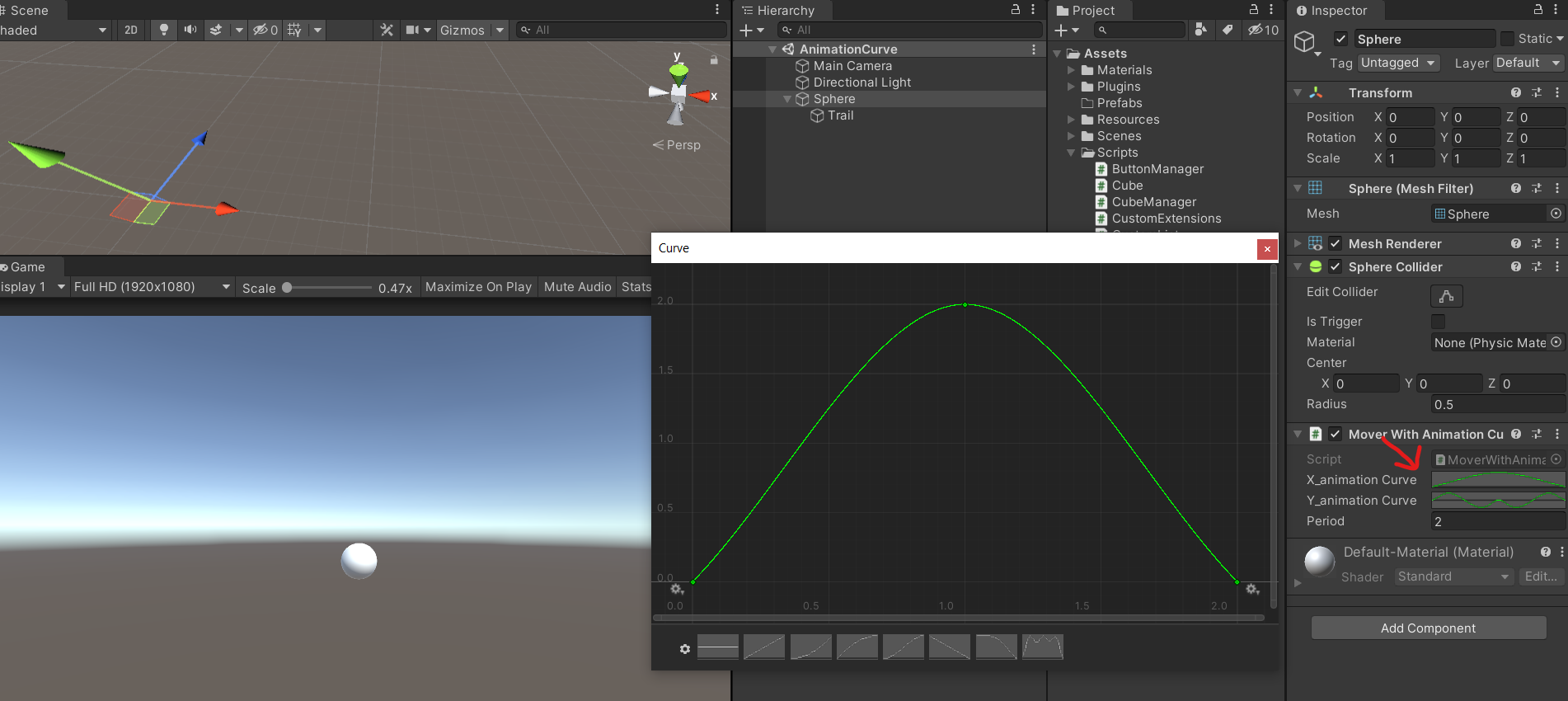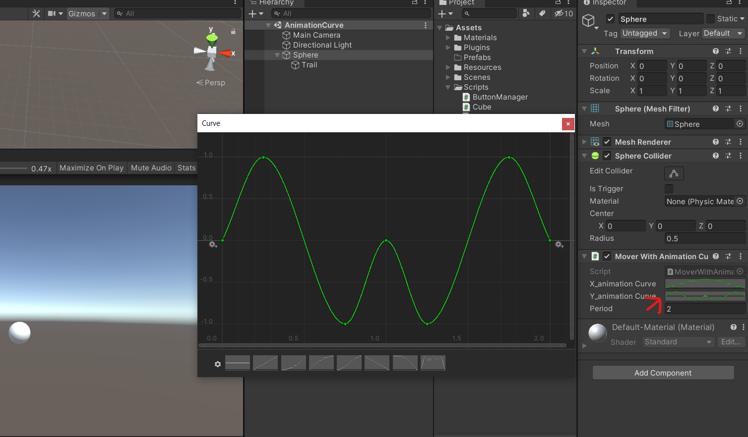 curTime이 period 만큼 지나게 되면 다시 0으로 바뀌게 됩니다 (curTime -= curTime) 이게 update로 계속 돌고 있습니다. 그리고 이 curTime은 animation curve에서 input 값으로 들어가게됩니다. 위 코드에서는 animation curve가 2개가 있는데 각각 sphere의 x 포지션과 y 포지션을 계산해 줍니다. 아래 사진은 각각 x 값 담당 animation curve와 y 값 담당 animation curve 입니다.