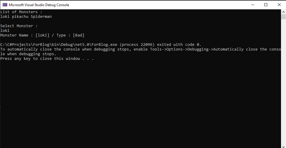 콘솔 프래그림을 실행시키고 "loki"라는 몬스터를 입력했을 때 인덱서를 사용해서 Monster 를 가지고 올 수 있었습니다