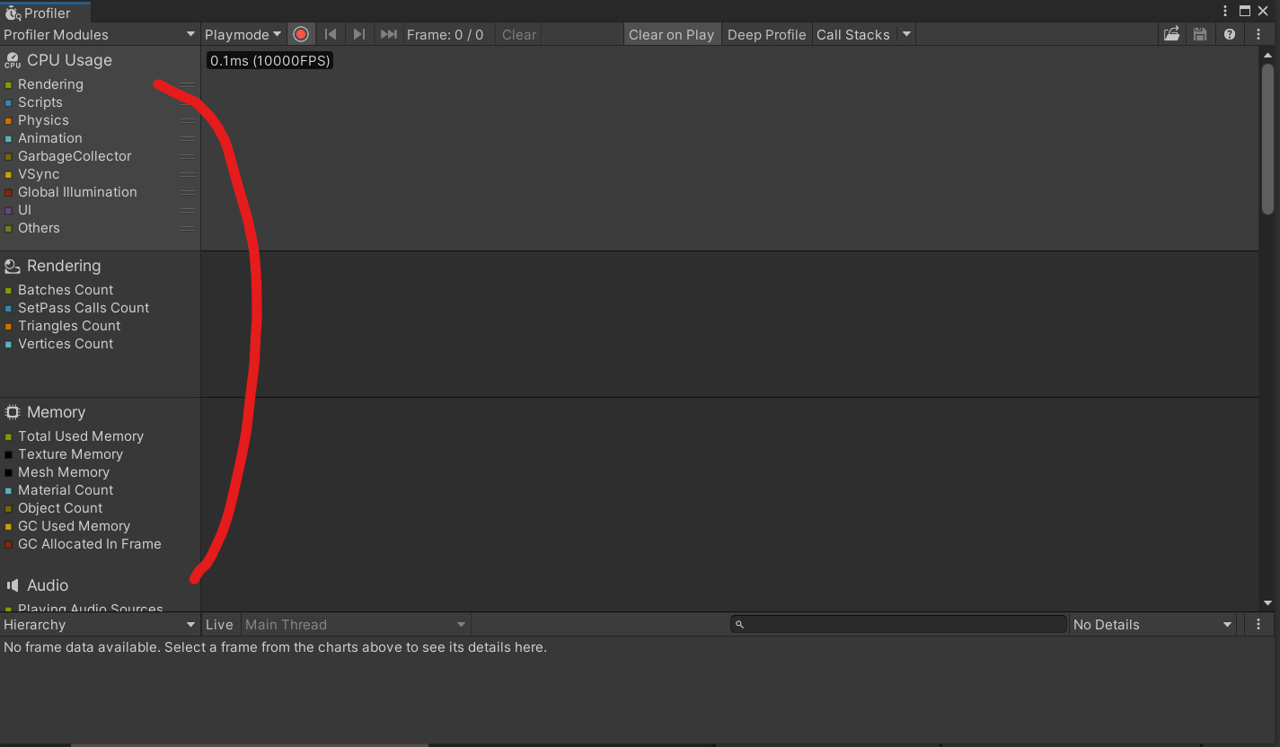 Profiler에서 빨간색 녹화버튼이 켜진 상태로 유니티 에디터에서 실행을 시키면 Unity Profiler가 그래프를 그리며 분석 내용을 아래 하단에 (파란색으로 표시) 세부 내용들이 기록되게 됩니다.