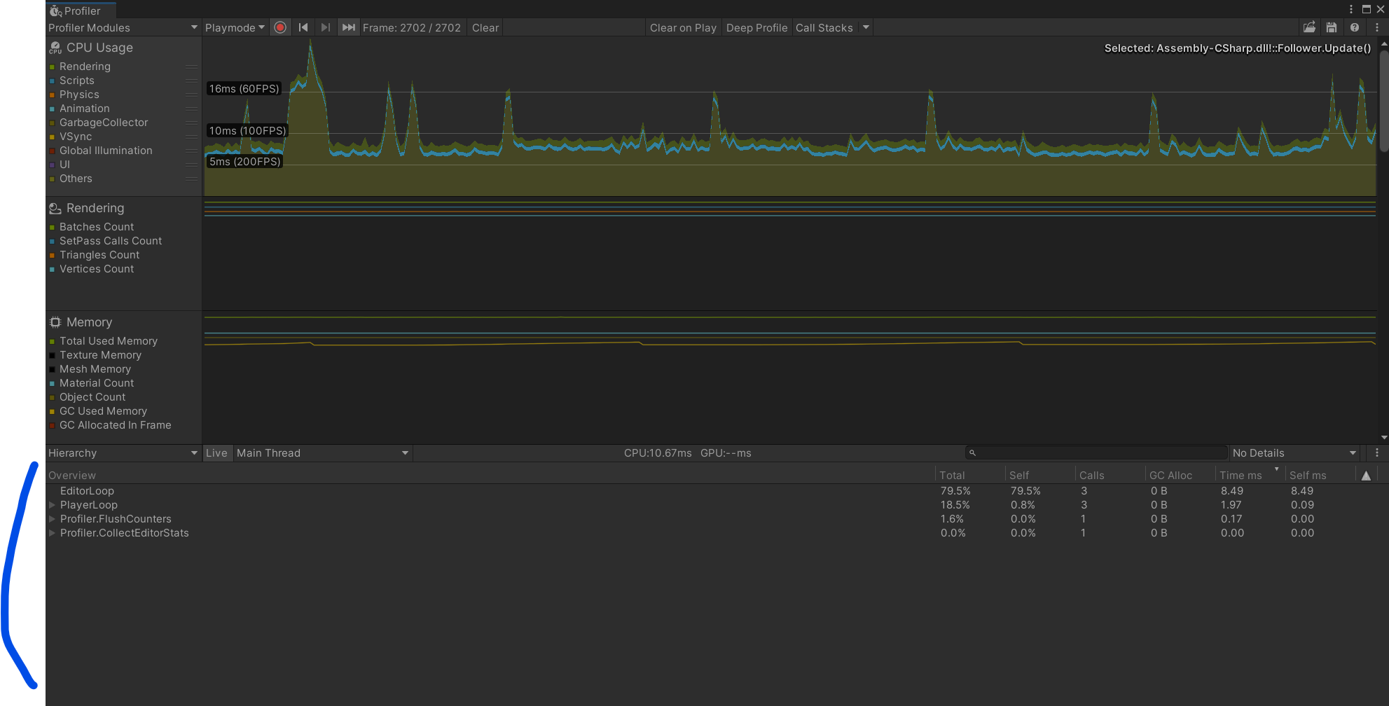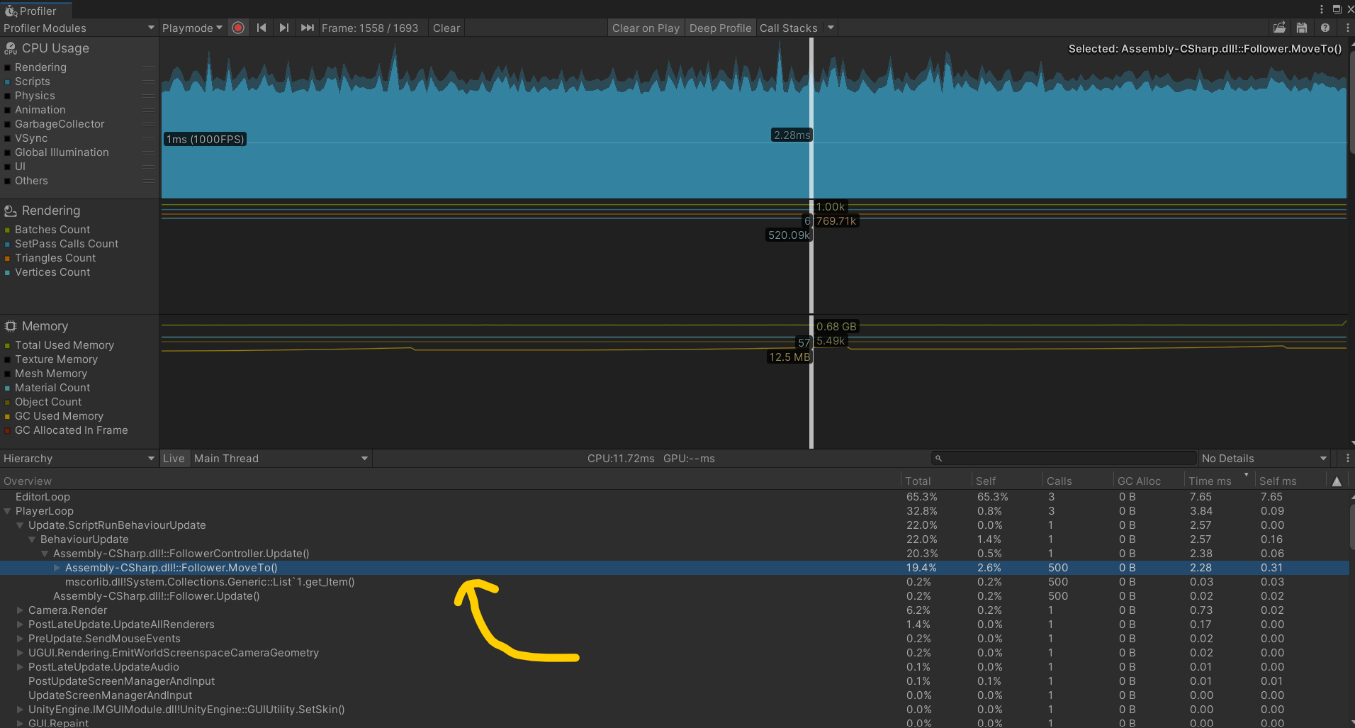 Update에서 한 프레임에 Follwer.MoveTo() 가 500번 Call 이 있는데, 제가 Follwer.MoveTo() 함수를 Update에서 for loop로 500번 돌리고 있기때문에 500 Call로 나옵니다. 500번의 Call을 하는데 걸린 시간이 2.23ms 이 걸렸다고 나오네요.
