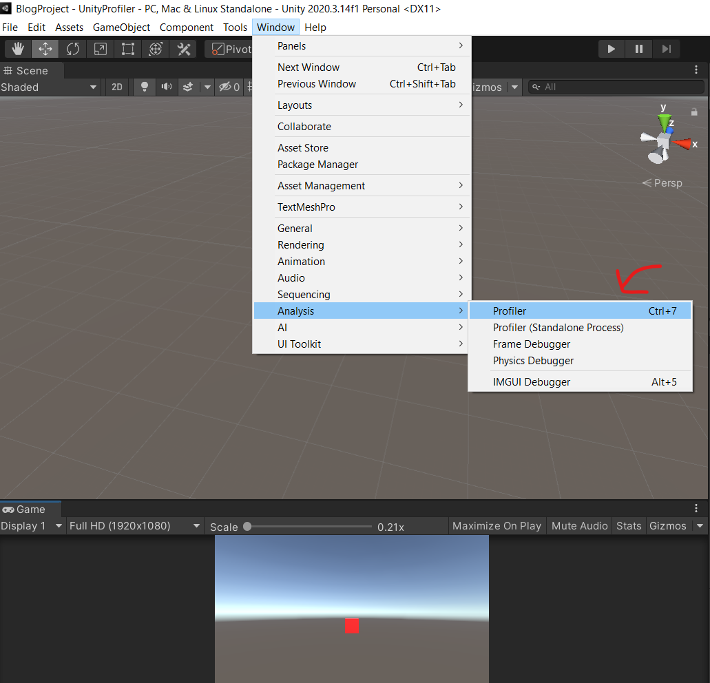 아래의 스크린샷에서 보여주듯이 Profiler창은 Window -> Analysis -> Profiler 로 가서 열 수 있습니다. (또는 간편하게 Ctrl + 7 단축키를 사용해서도 열 수 있습니다)