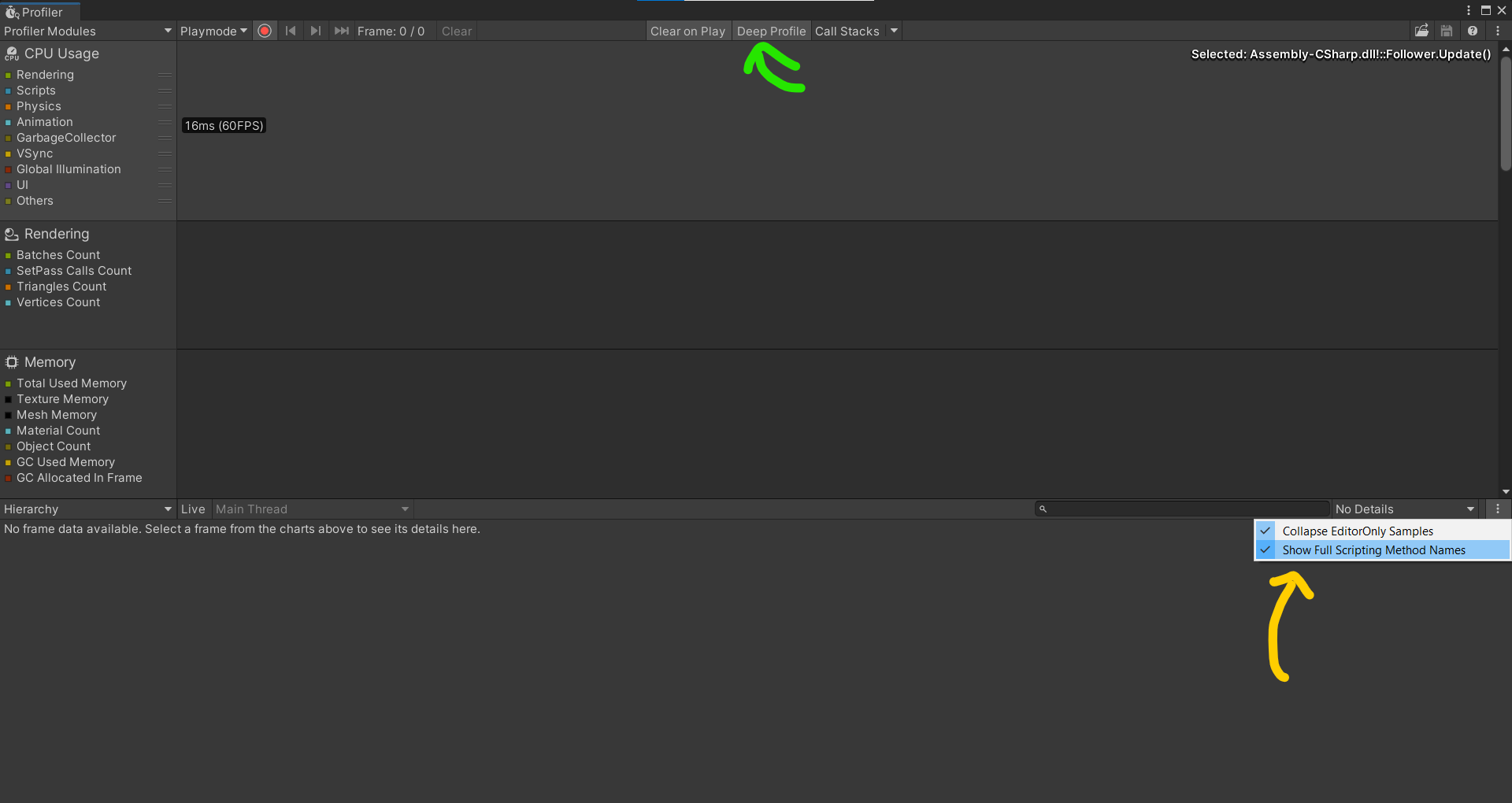 Deep Profile을 켜고 (초록색 화살표), 그리고 Show Full Scripting Method Names (노란색 화살표) 를 체크해서 스크립트 어느 부분에서 얼마만큼의 시간이 걸리고 등등 정보를 확인할 수 있습니다.