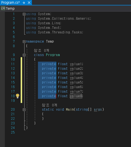 아래 스크린샷은 변수들의 private 부분을 Alt + 마우스 드래그로 지전된 모습이다.