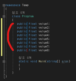 아래 스크린샷은 변수들의 private 부분을 Alt + 마우스 드래그로 지전된 모습이다.