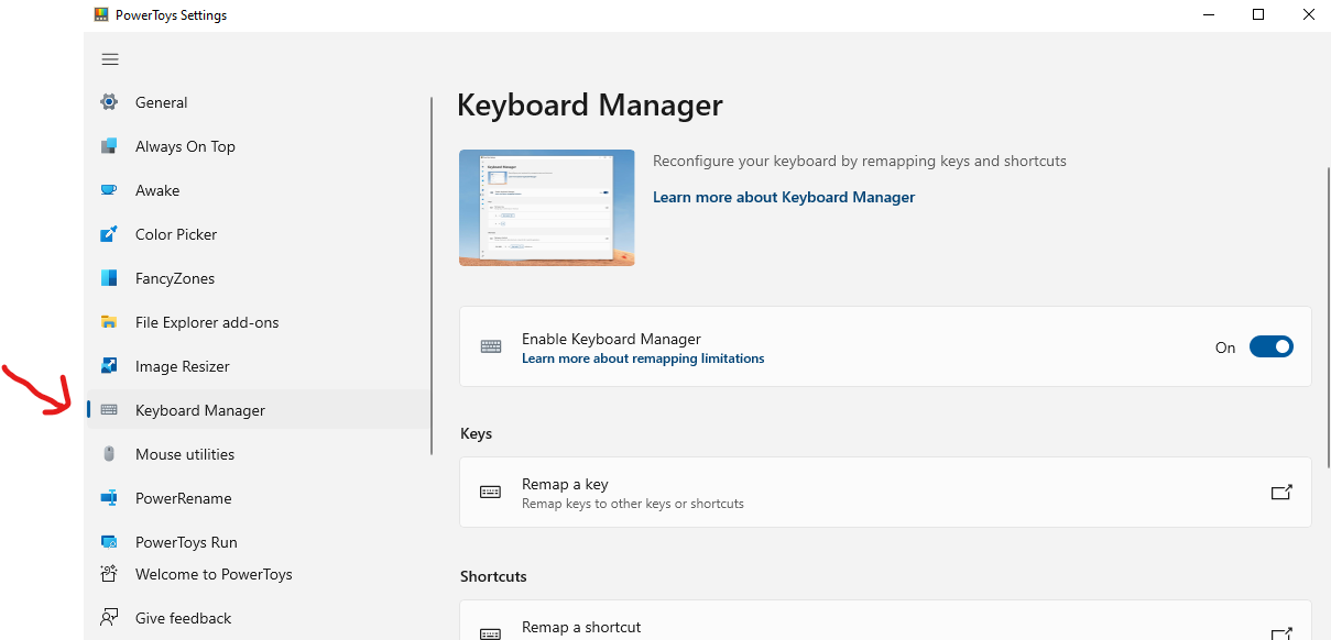 다운 받은 후 실행을 하면 아래 스크린샷처럼 나오고, Keyboard Manager 탭에서 Keyboard Remap과 Shortcut 등록을 할 수 있다.