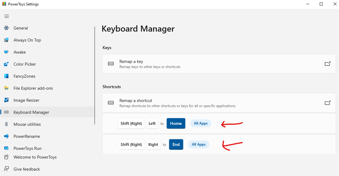 나는 "home" 키와 "end"키를 각각 "fn키 + 왼쪽방향키", "fn 키 + 오른쪽방향키" 로 shortcut을 등록하고 싶었는데, Power Toys가 fn 키를 인식하지 못해서 (다른 대부분의 keymapping software 도 인식하지 못하는 것 같다. 키보드 회사에서 직접 제공 해주는 Keymapping software는 제외), fn 키 대신에 오른쪽 shift키로 대체했다.