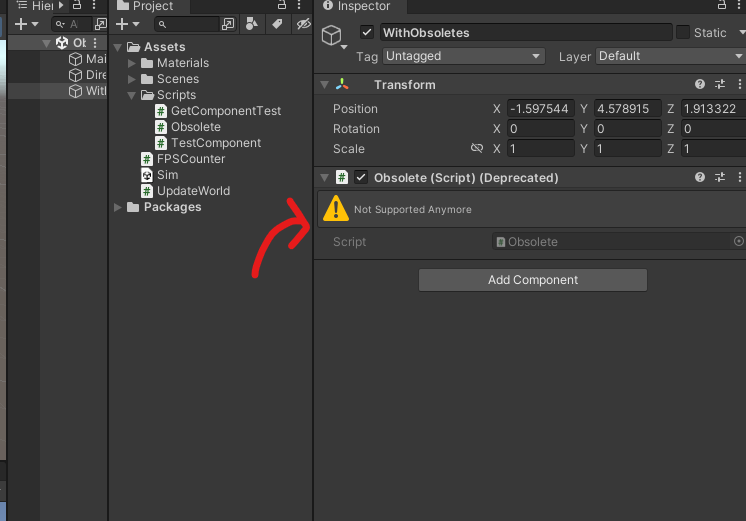 유니티에서는 Monobehaviour를 상속받는 클래스, 즉 컴포넌트로 쓰일 클래스 앞에 Obsolete를 쓰면, 다음과 같은 모습이 인스펙터에서 보인다.