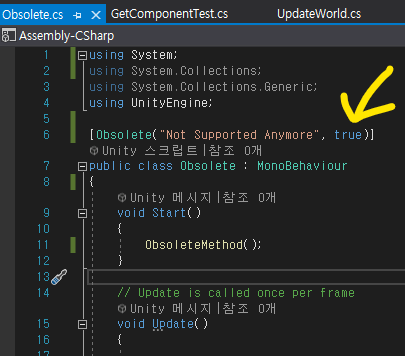 추가로, Obsolete 파라미터로 메세지 string 값 뒤에 bool 값을 하나 더 넘길 수 있는데, true 값을 넘기면 error 표시를 하게 해준다.(노란색 화살표).