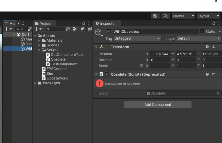 유니티에서는 Monobehaviour를 상속받는 클래스, 즉 컴포넌트로 쓰일 클래스 앞에 Obsolete를 쓰면, 다음과 같은 모습이 인스펙터에서 보인다.
