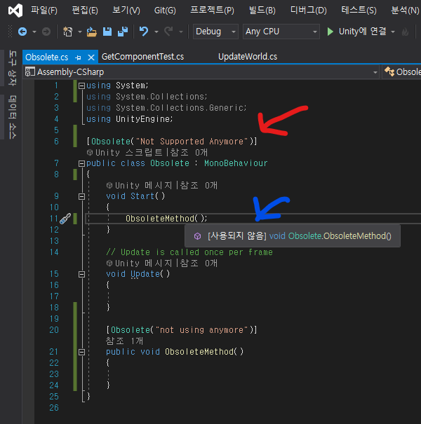 그리고 함수 앞에 Obsolete를 추가하게 되면 해당 함수를 사용했을 때, 마우스를 Hover했을 때 [사용되지않음] 이라는 메세지를 볼수 있다 (파란색 화살표)