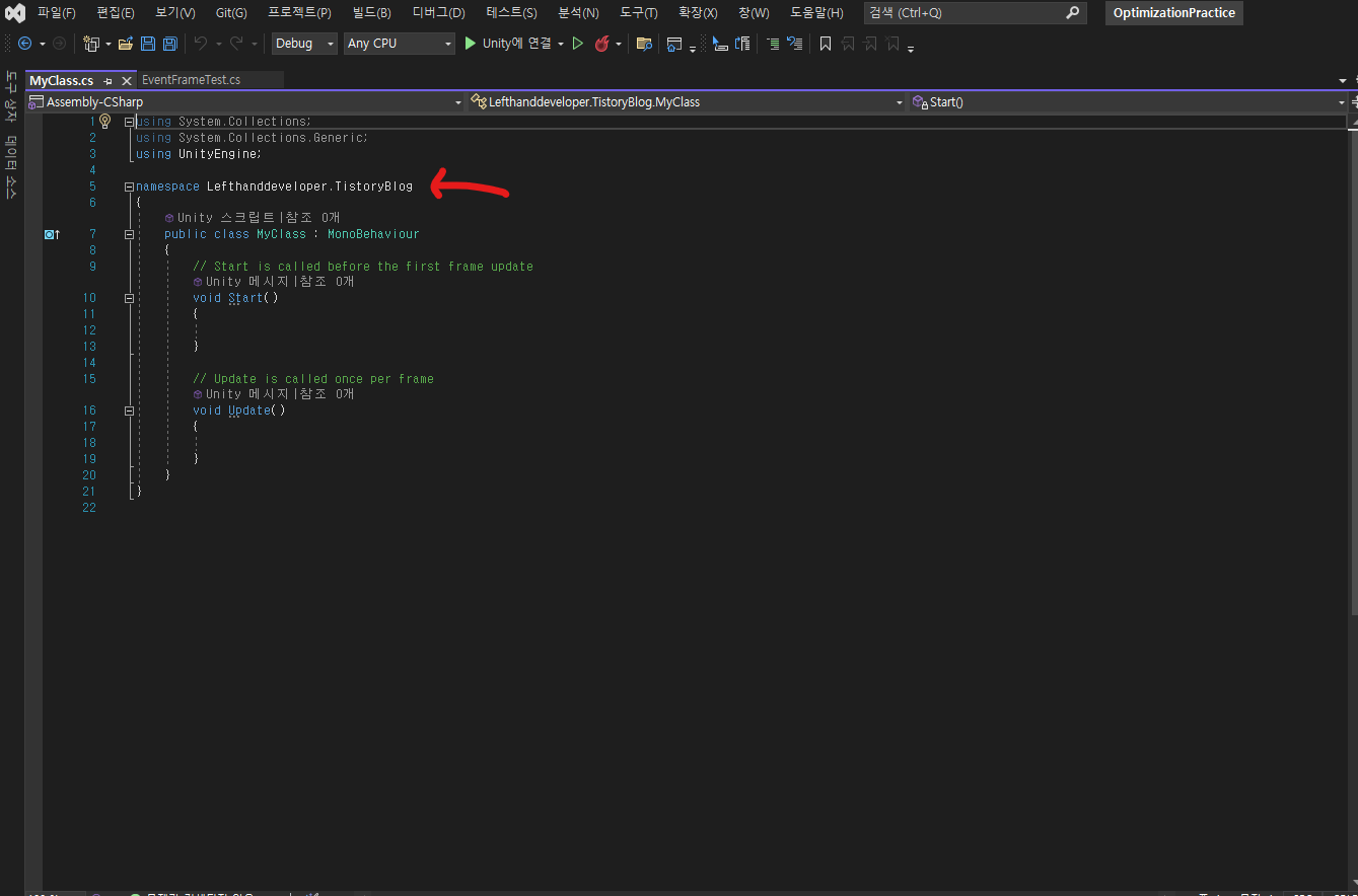 * Visual Studio 솔루션탐색기에서 생성한 class는 해당 기능이 적용되지 않는다. 오직 유니티 에디터에서 클래스를 생성했을 때에만 적용된다.