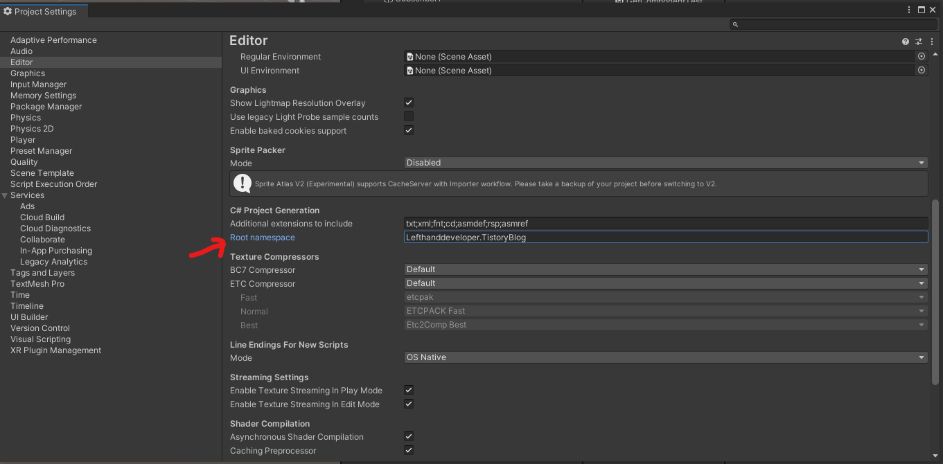 Project Settings > Editor > Root namespace 란에 미리 지정할 namespace를 작성하면 된다. 아래 스크린샷에서 나는 "Lefthanddeveloper.Tistory"로 지정했다.