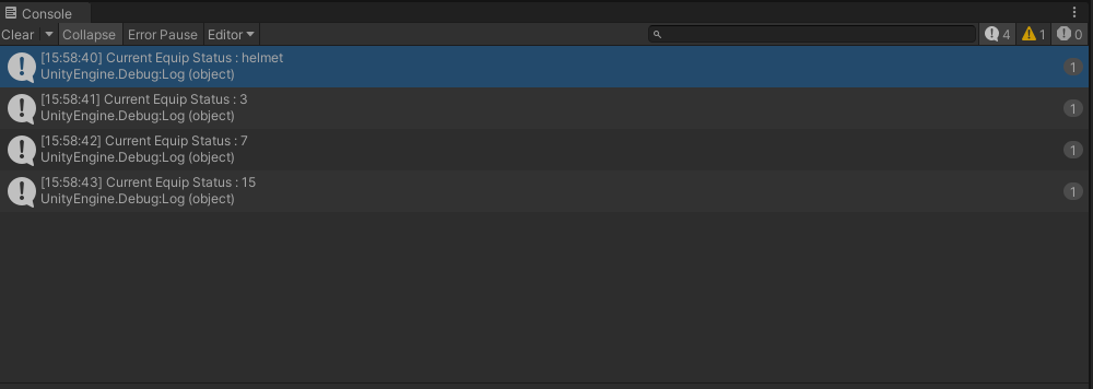 숫자 1~4 까지 bitwise "|" operation으로 착용 상태를 더해주고 equipStatus를 Debug했을 때에 enum 값이 string으로 출력되는 것을 볼 수 있다.