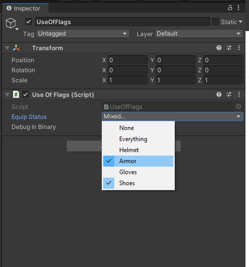 UseOfFlags라는 컴포넌트를 하나 만들어서, EquipStatus 변수를 public으로 선언하고 인스펙터에서 보면, 흔히 layer 를 선택할 수 있는 것처럼 다중 선택을 할 수 있다.