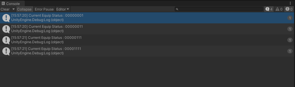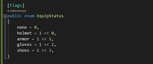 숫자 1~4 까지 bitwise "|" operation으로 착용 상태를 더해주고 equipStatus를 Debug했을 때에 enum 값이 string으로 출력되는 것을 볼 수 있다.