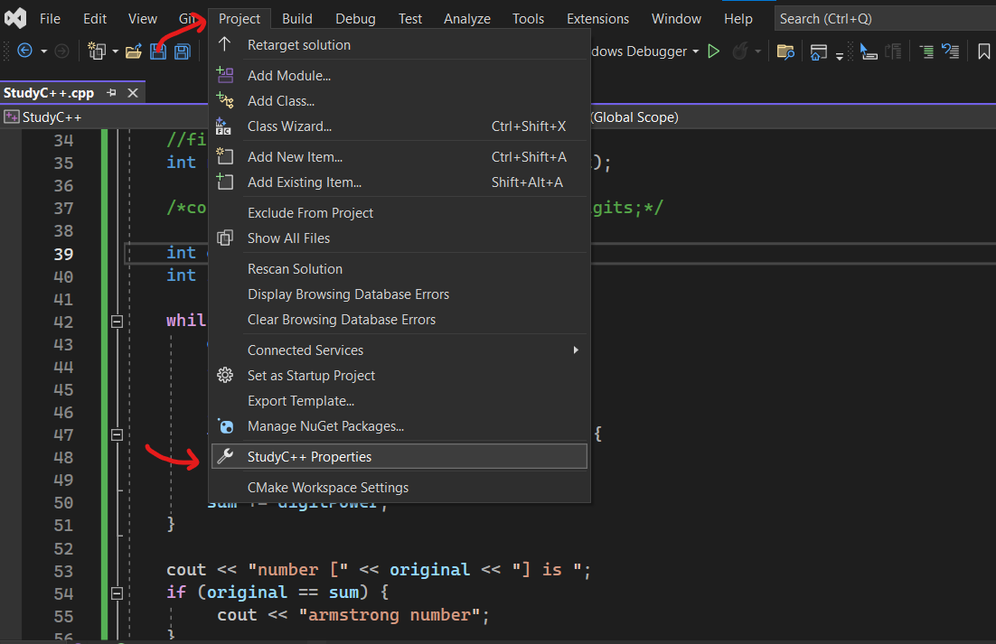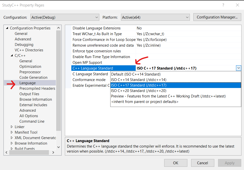 Visual Studio Tab Menu → Project → Properties → Configuration Properties → C/C++ → Language → C++ Language Standard 바꾸기